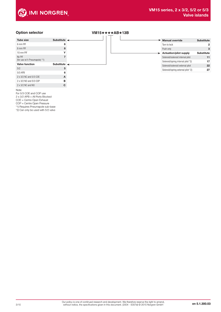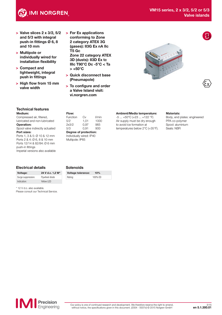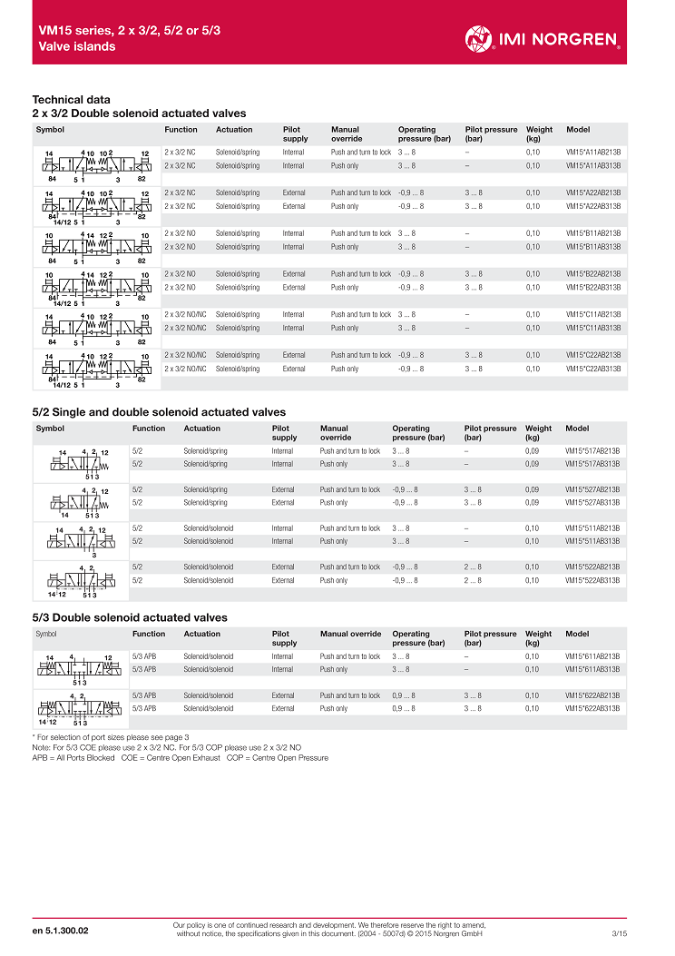 VM15 series, 2 x 3/2, 5/2 or 5/3with integral push-in fittings ? 6, 8 and 10 mm,Valve islands