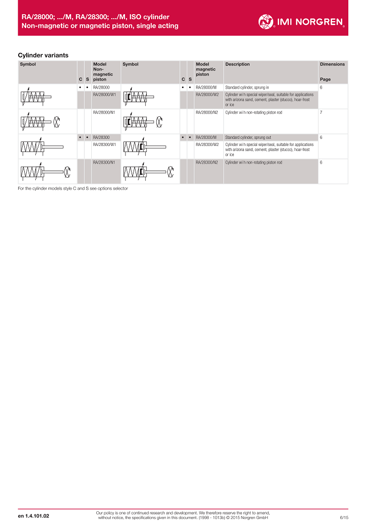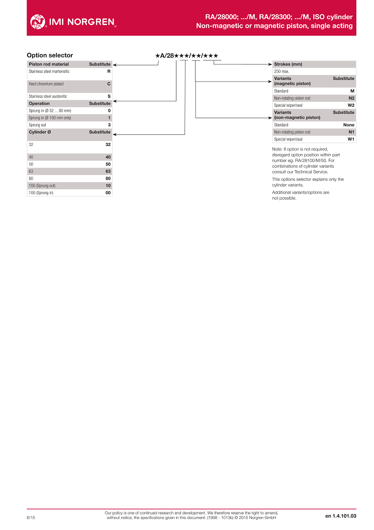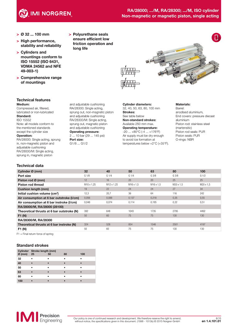 RA/28000; .../M, RA/28300; .../M, ISO cylinder,Non-magnetic or magnetic piston, single acting,? 32 ... 100 mm